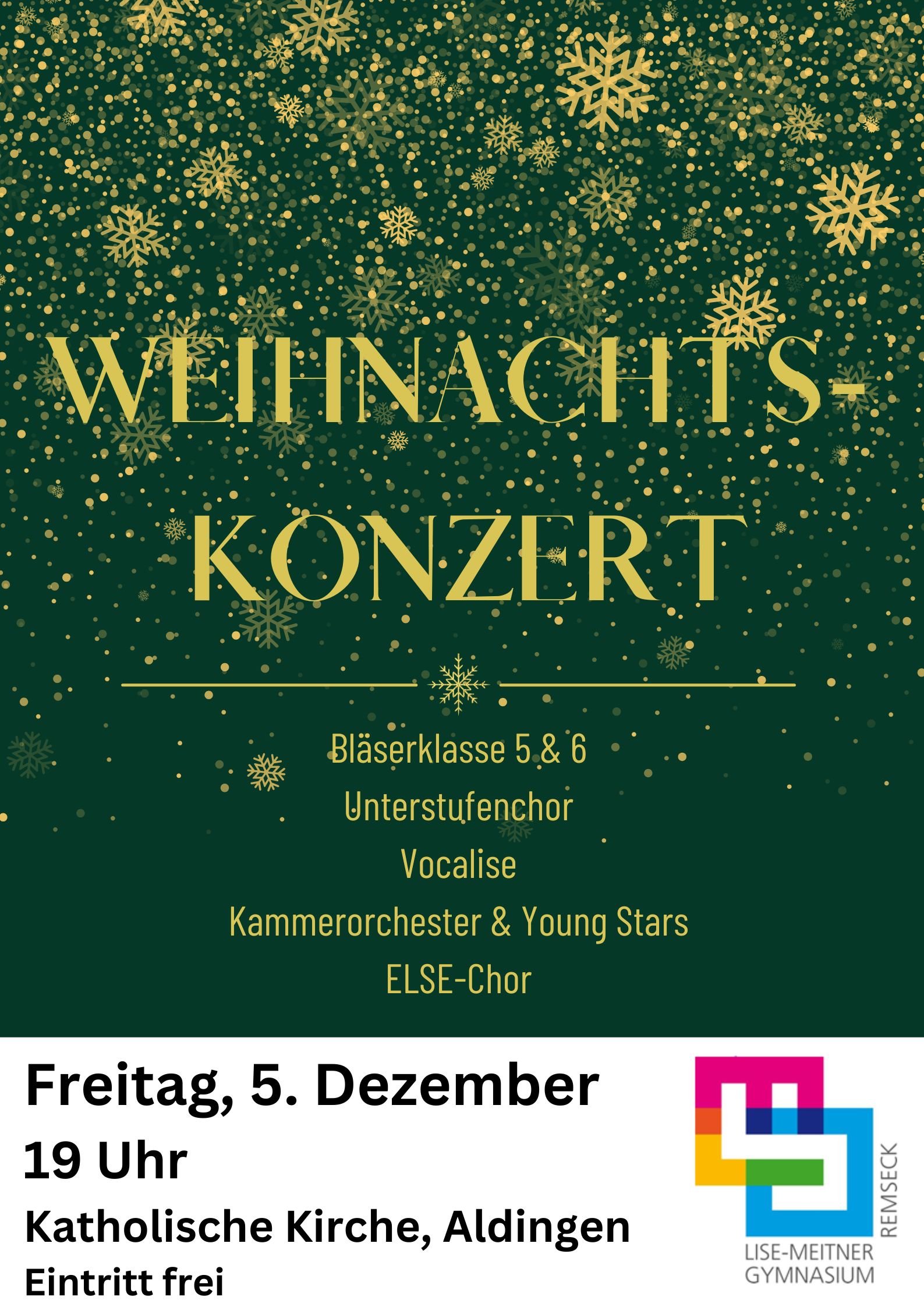 Das Lise-Meitner-Gymnasium Remseck lädt Sie herzlich zum diesjährigen Weihnachtskonzert am 5.12.2025 um 19 Uhr in der Katholischen Kirche in Aldingen ein. Es spielen die Bläserklasse 5&6, das Kammerorchester und die Young Stars und es singen der Unterstufenchor, Vocalise und der ELSE-Chor.